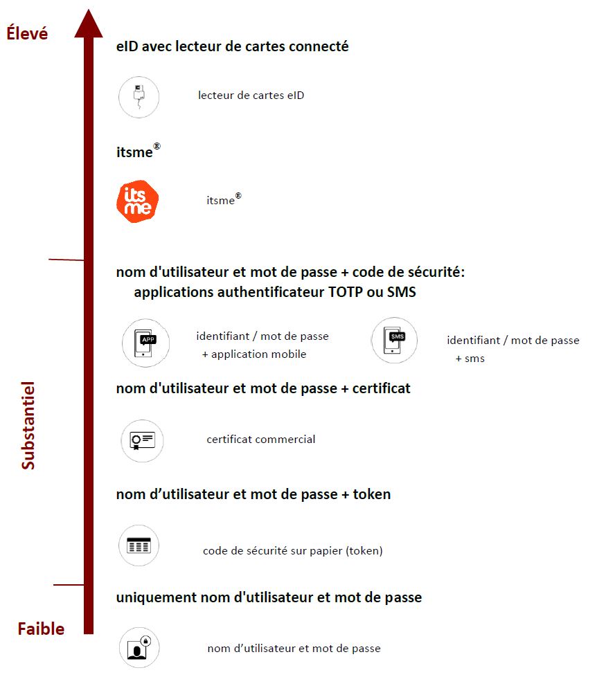 L'« Identification CSAM » propose plusieurs « clés numériques », qui sont réparties en différents niveaux de sécurité. La sensibilité des informations auxquelles l'utilisateur a accès dans les services en ligne ou dont il a besoin, détermine le niveau de sécurité. Le niveau de sécurité requis dépend donc du degré de confidentialité des informations utilisées par les services en ligne :